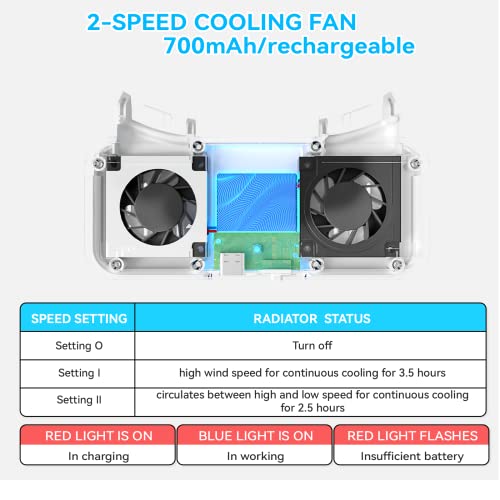 Ausgezeichnetes Kühlsystem: Built-in 2 Mikro-Turbo-Fans, 2 Geschwindigkeitsstufen. Setting 1: Hohe Windgeschwindigkeit für kontinuierliche Kühlung, die Luftzirkulation mehr als 60 Times in 1 Minute, geeignet für intensives Spielen; Setting 2: Die wind speed circulates between hoch und niedrig für kontinuierliche Kühlung, geeignet für Bewegung oder Chat. Hibloks Radiator für Quest 2 kann kontinuierlich für 3,5 Stunden verwendet werden, wenn volle Ladung ist.